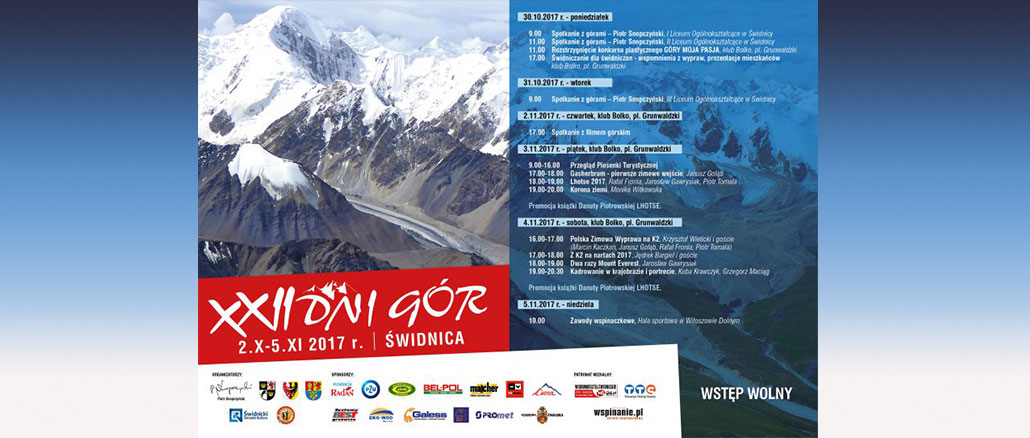 W dniach 30 października – 5 listopada 2017, Świdnica będzie gościła znakomitości polskiego alpinizmu. Wydarzenie pod nazwą XXII DNI GÓR organizowane jest przez Świdnicki Ośrodek Kultury i przewiduje następujący program: