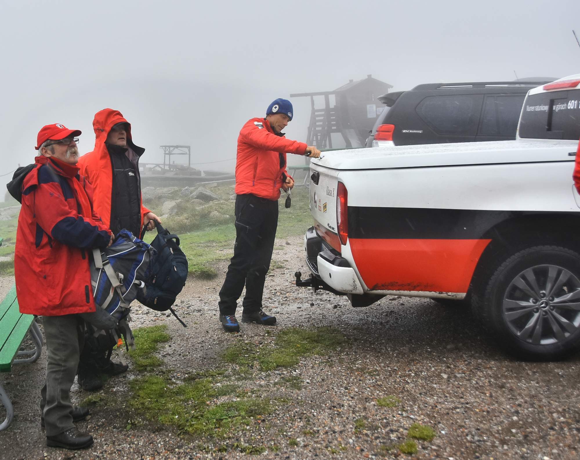 Pełniący służbę ratownicy przywitali nas bardzo miło i przyjaźnie. Ponieważ padał deszcz, a drogi na Halę Szrenicką nie można było przebyć kolejką, musieliśmy poczekać na samochód, który zabrał nas na uroczystość. Spędziliśmy ten czas w miłej atmosferze z miejscowymi ratownikami.