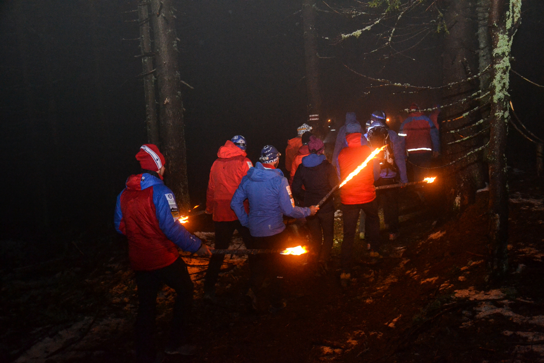 Po części oficjalnej uformował się przed schroniskiem długi pochód, który przy blasku pochodni udał się na nieodległy szczyt Turbacza. Młodsi stażem koledzy wyruszyli na szczyt kilka minut po wszystkich, prowadzeni przez poczet sztandarowy Grupy Podhalańskiej GOPR oraz kapelę górską, przy dźwiękach której zostali doprowadzeni do rozpalonej watry i symbolicznie weszli w krąg czekających na nich kolegów.