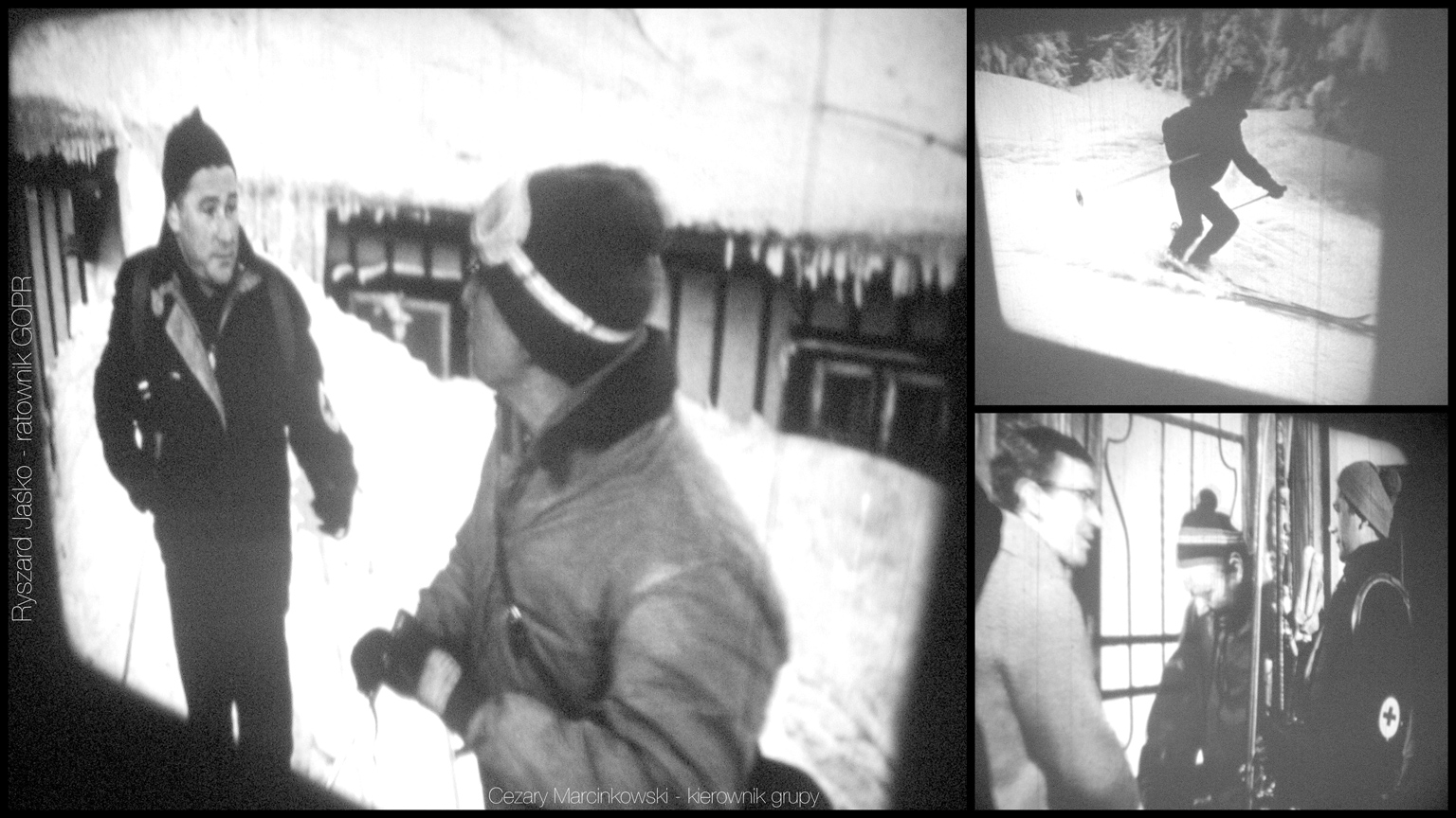 Na zamieszczonych zdjęciach – kadry z filmu oglądanego po latach z projektora i celuloidowej taśmy! – odnajdujemy dwóch czynnych wtedy ratowników Grupy Sudeckiej GOPR: Czarka Marcinkowskiego – szefował wtedy w Strzesze Akademickiej i Ryszarda Jaśko – wówczas pracownika wyciągu na Małą Kopę.