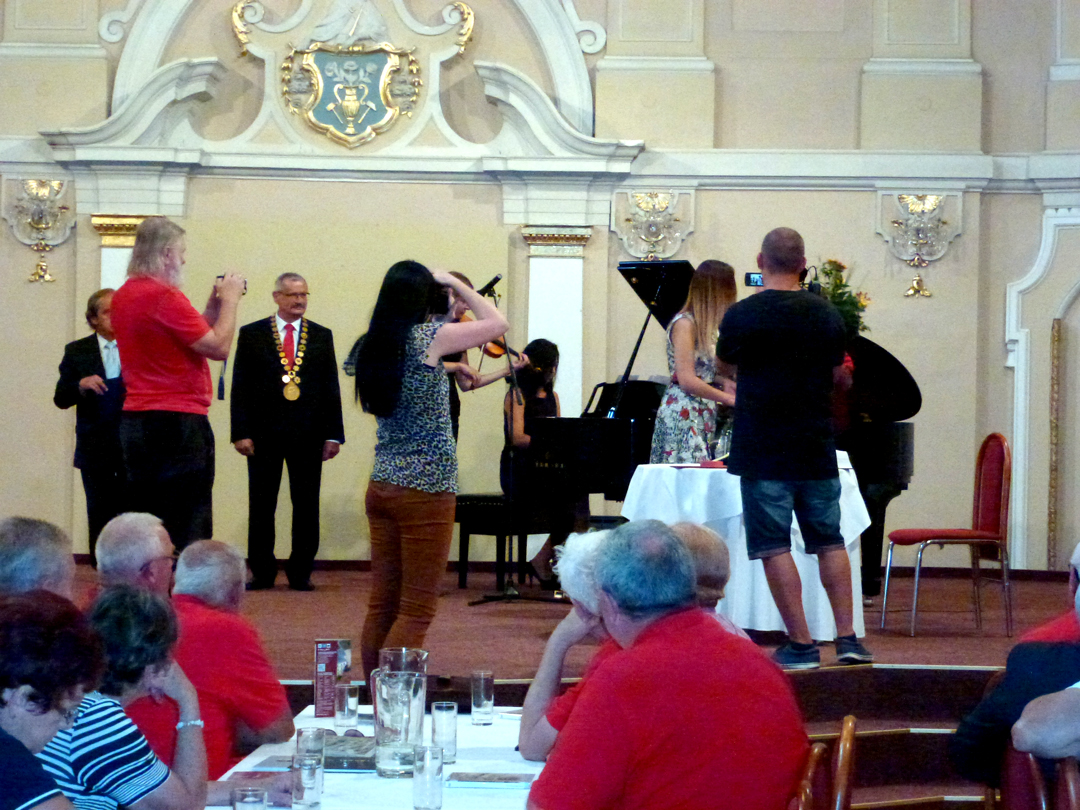 Było podniośle: muzyka, pieśni, skrzypce, przemówienie p.primatora, wpis wszystkich przewodniczących klubów seniora do Księgi Pamiątkowej Miasta oraz wręczenie listów gratulacyjnych wraz z koszami kwiatów dla zasłużonych seniorów z HS Słowackiego Raju: Karola Hrica – wieloletniego przewodniczącego tamtejszego klubu seniora i zasłużonego działacza turystyki oraz Vladimira Petrika, mistrza sportu SR , znanego taternika i alpinisty, uczestnika narodowych wypraw na Manaslu i Mount Everest.