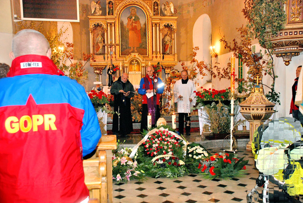 Żegnała Go bliska rodzina, przyjaciele i znajomi. Tym razem karkonoska jesień nie była łaskawa. Zimnem i chmurami żegnała Człowieka, który górom oddał 40 lat swojego życia. Uroczystości żałobne, a przede wszystkim Msza celebrowana przez księży Franciszkanów i kapelana naszej Grupy, ratownika ks.Michała, zmuszała do refleksji nad przemijaniem.
