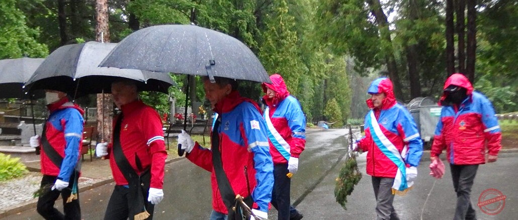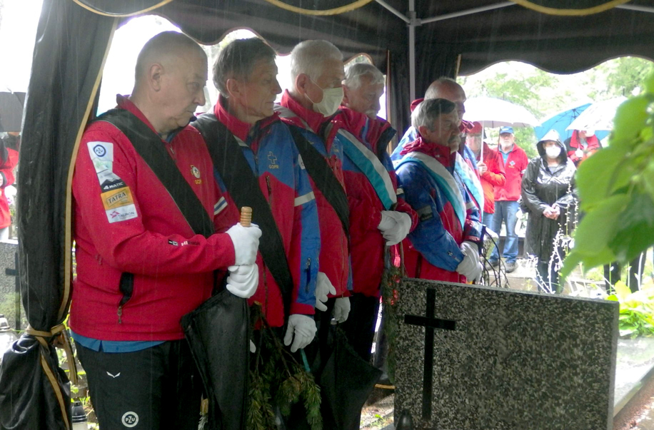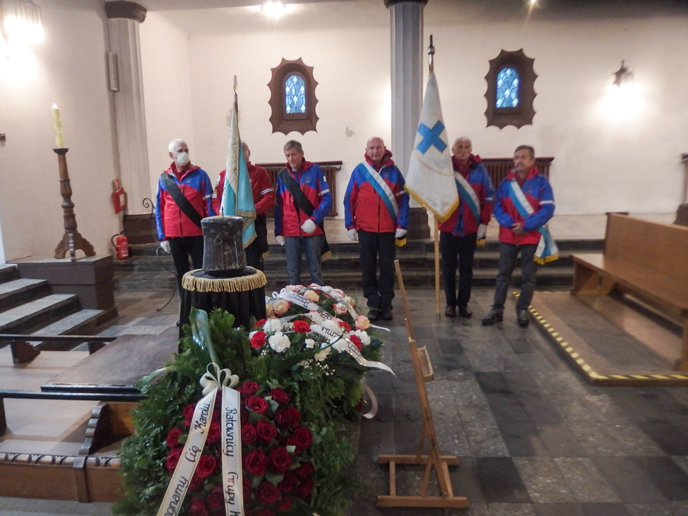 Pogoda spowodowała, że po raz pierwszy ze sztandarami Grup staliśmy tylko w kaplicy obok urny z prochami. Natomiast samo odprowadzenie Karola do miejsca spoczynku odbyło się bez sztandarów, bowiem perspektywa ilości wody jaką mogłyby pochłonąć wymusiła taką decyzję. Przykre, że pogoda zdecydowała za nas takie zachowanie, ale perspektywa zniszczenia sztandarów przeważyła. Ktoś powie, że przecież można wysuszyć mokrą tkaninę, ale zacieki jakie powstają w takim momencie są już niestety nie do usunięcia. Mam nadzieję, że Karol to zrozumiał i wybaczy nam taki sposób postępowania, ale naprawdę nie było wyjścia.