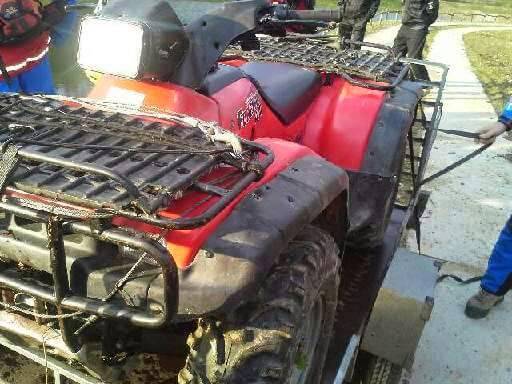 Próbowaliśmy krzykiem go odgonić – zwierzak nie reagował. Po chwili doszła tyraliera strażaków, wspólna akcja pokrzykiwań i gwizdów nie dawała rezultatu. Wpadliśmy więc na pomysł, żeby dla odstraszenia intruza użyć dużego samochodu Straży Pożarnej. Podjechaliśmy bardzo blisko przewróconego quada przy którym stał Miś i wcale nie miał zamiaru odejść. Po dłuższej chwili zdecydował się na odwrót. Niezbyt chętnie, należy zaznaczyć. Podeszliśmy do potłuczonego quada, postawiliśmy go na koła – o dziwo zapalił. Mimo uszkodzeń udało się nim wrócić do bazy.